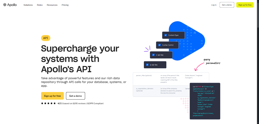 Apollo’s API taps directly into Apollo’s massive B2B dataset and lets you pull the exact contact or account info you need, on demand.