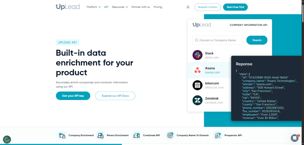 UpLead’s API is perfect when you want accurate company and contact data without the messy guesswork. It’s built to feel predictable, fast, and simple, so you can enrich leads or power an entire product feature with very little setup.