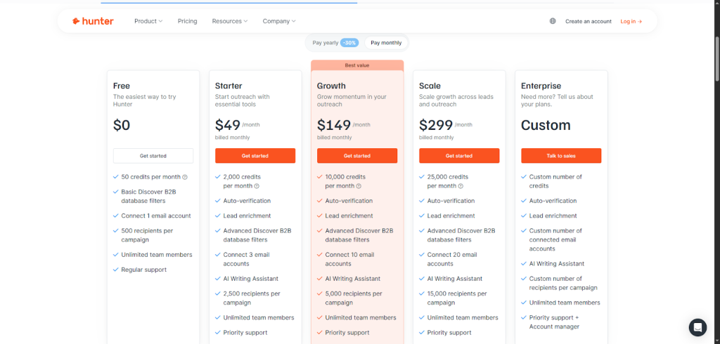 Let’s talk money, because getting the right Hunter.io plan can save you loads of hassle (and cash). No matter if you’re a solo founder or part of a 20+ seat sales team, knowing exactly what you’re paying for is key.