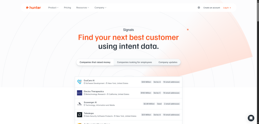 Hunter also offers Signals, which delivers intent data – basically, it highlights prospects showing buying signals or active interest. This helps you prioritize who to contact first.