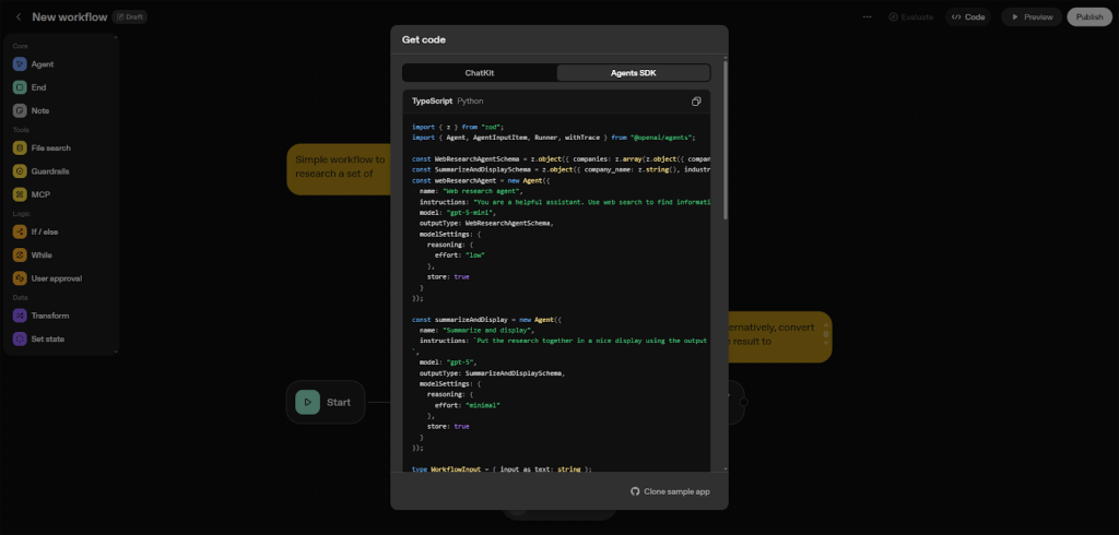 When it’s time to bring your workflow outside the builder, export options have you covered. You can export your creations as TypeScript or Python code. This opens up seamless integration with backend systems such as FastAPI, AWS Lambda, Azure Functions, or even tying everything into CI/CD pipelines like GitHub Actions.