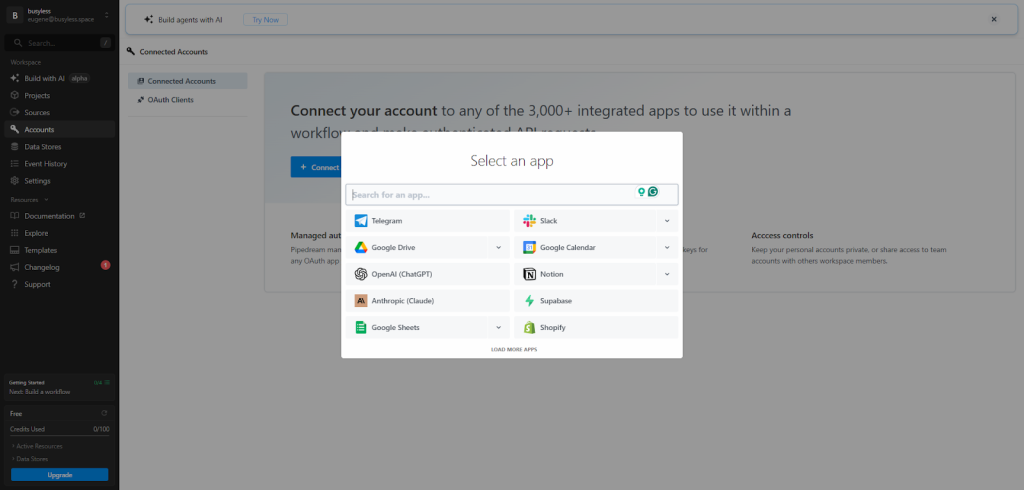 - Massive integrations with managed Auth → you don’t have to wrestle with API keys or OAuth problems. Pipedream takes care of authentication securely, so you can connect to hundreds of apps quickly.