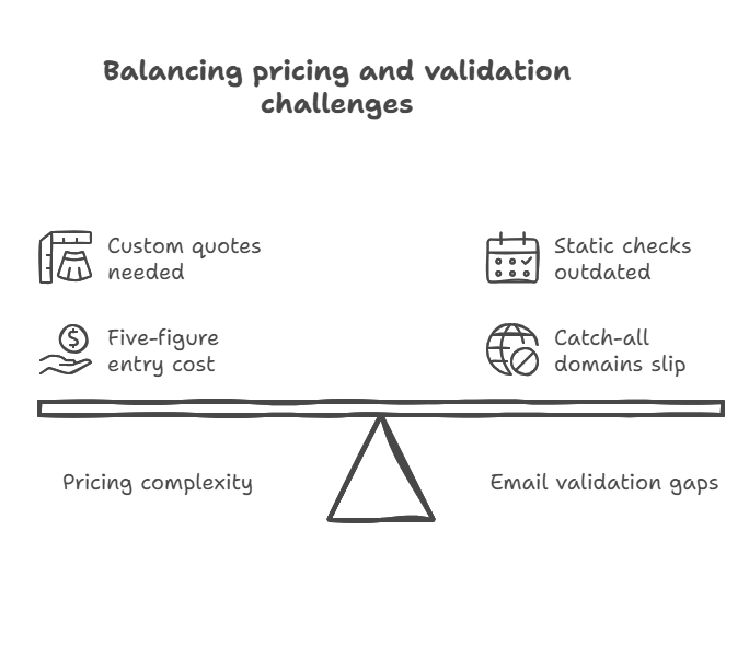 | Validation | NeverBounce integration; catch-all issues. | Catch-all validation reduces risky addresses to ~10%. |
